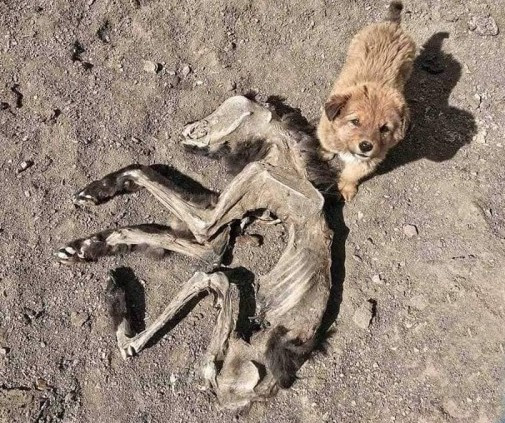In the images, the lonely puppy sits quietly next to the skeletal remains of its mother, surrounded by a barren, desolate landscape. The contrast between life and loss, between innocence and tragedy, has left viewers heartbroken.